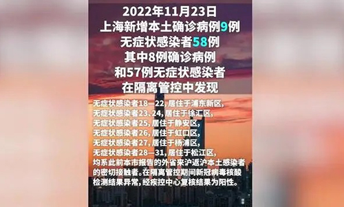 上海市衛(wèi)健委今早(11月24日)通報(bào):2022年11月23日0—24時(shí),新增本土新冠肺炎確診病例9例和無癥狀感染者58例,其中8例確診病例和57例無癥狀感染者在隔離管控中發(fā)現(xiàn)。
