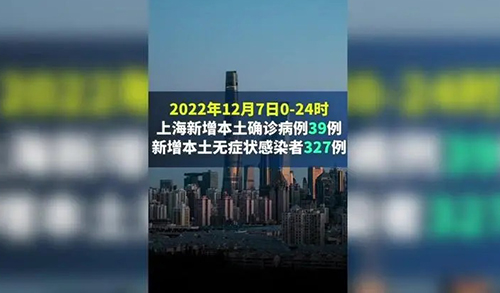 上海市衛健委今早(12月8日)通報:2022年12月7日0—24時,新增本土新冠肺炎確診病例39例和無癥狀感染者327例.