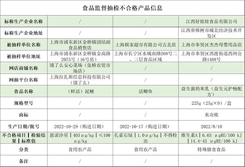 上海市市場監管局近期開展我市食品安全抽檢。本次抽檢信息涉及7大類食品,包括:糧食加工品、酒類、蛋制品、薯類和膨化食品、糖果制品、特殊膳食食品和食用農產品等。抽檢樣品共計1066批次,其中合格1063批次、不合格3批次。