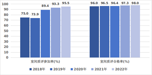 圖5?2018-2022年三級公立醫(yī)院室間質(zhì)評項(xiàng)目參加率和合格率情況