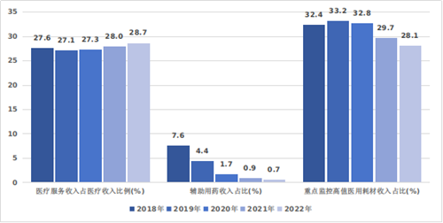 圖7??2018-2022年三級公立醫(yī)院收入結(jié)構(gòu)情況