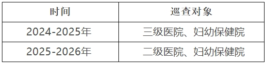 分批次、按年度開展巡查工作。三級綜合醫院巡查時間原則上不少于7天,三級專科醫院、康復醫院、婦幼保健院和二級醫院原則上不少于5天。2026年10月底前完成巡查工作。巡查總體計劃如下: